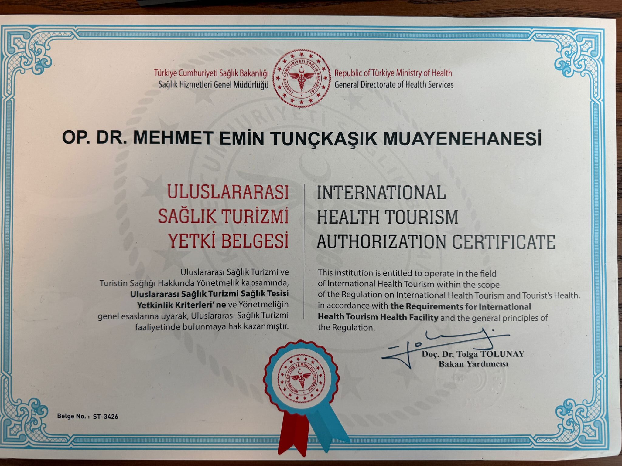 Tesisimiz, Uluslararası Sağlık Turizmi ve Turistin Sağlığı Hakkında Yönetmelik kapsamında, Uluslararası Sağlık Turizmi Sağlık Tesisi Yetkinlik Kriterleri’ne ve Yönetmeliğin genel esaslarına uyarak, Uluslararası Sağlık Turizmi faaliyetinde bulunmaya hak kazanmıştır.